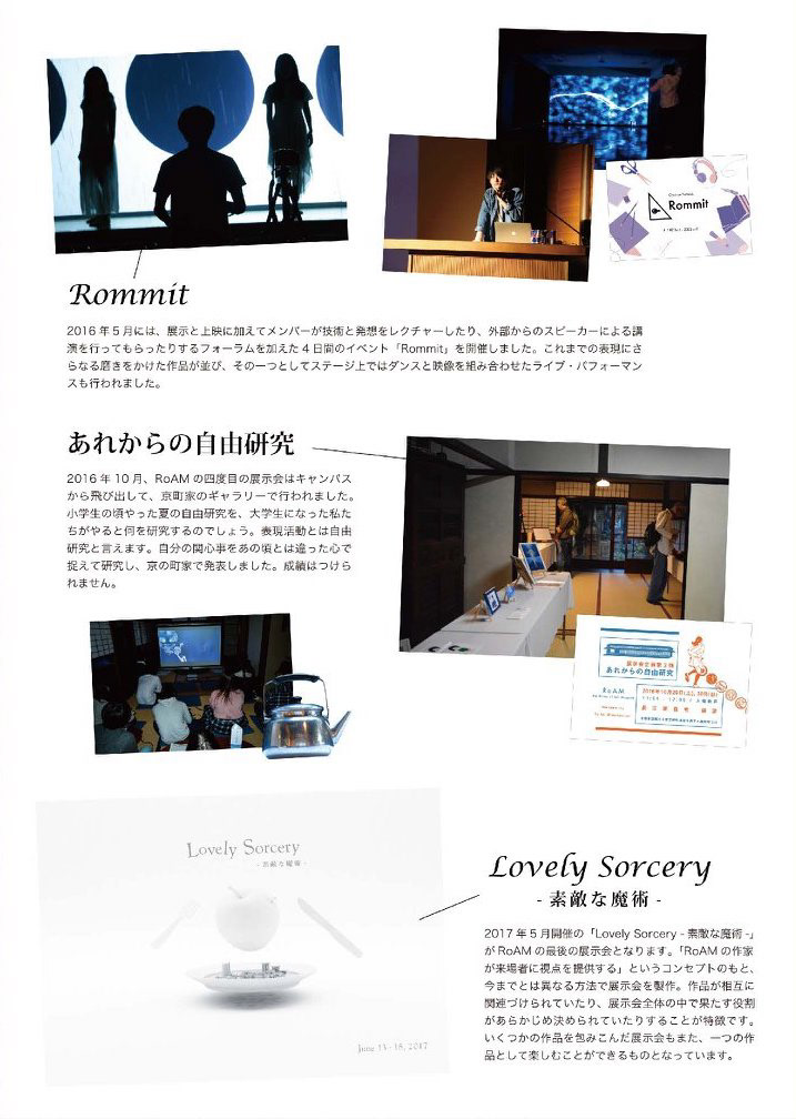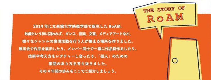 2014年、立命館大学映像学部の十数名が自らの表現活動とその学びを追求できる環境をつくるため、「映像」という枠に囚われず、ダンス・音楽・文章・メディアアートなど、さまざまなジャンルの制作活動ができるクリエイターズコミュニティ「RoAM(the Room of Art Museum)」を立ち上げました。
